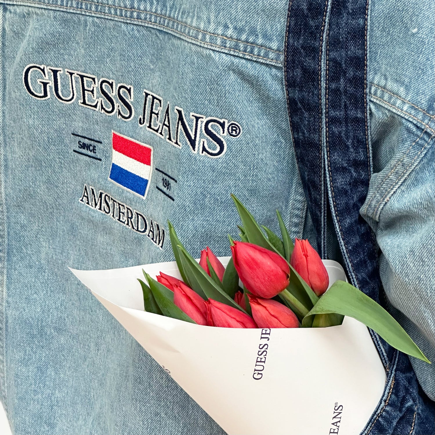 To celebrate 40 years of denim, Guess Jeans surprised their ambassadors with a staple denim jacket and a bouquet of fresh Dutch tulips in costumized wrapping paper.