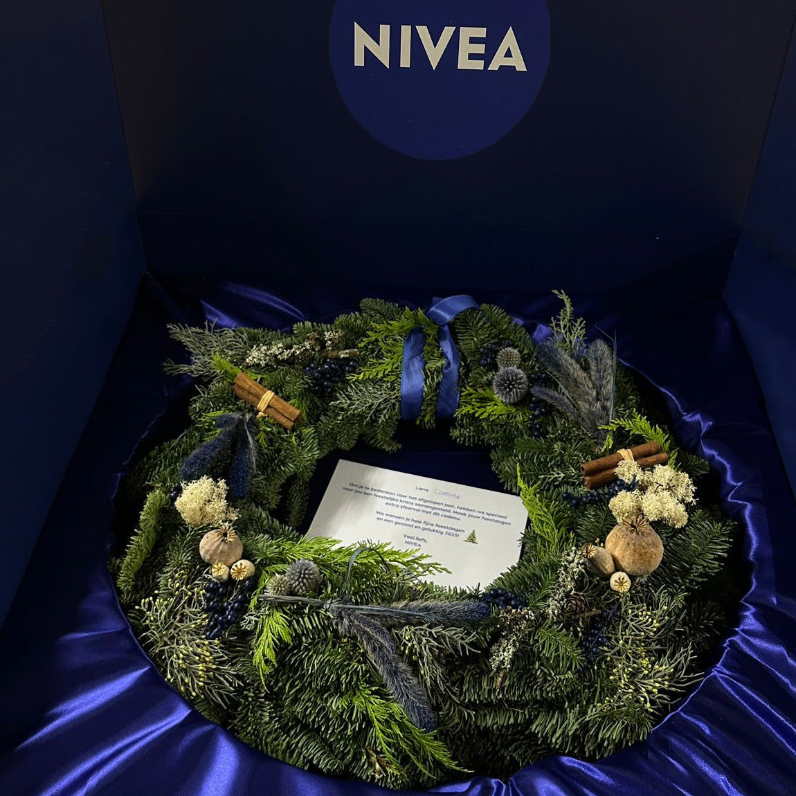 In collaboration with Nivea, we crafted these customized Christmas wreaths, designed to embody the brand's timeless elegance and soothing essence. The design reflects Nivea’s classic style while adding a festive touch, making it a perfect holiday gift.